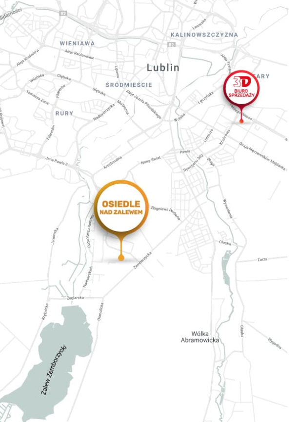 Osiedle nad Zalewem położone jest w spokojnej i zielonej dzielnicy Wrotków w Lublinie, przy ul. Wolińskiego 6. Lokalizacja ta łączy w sobie atuty bliskości natury oraz wygody codziennego życia w mieście. Tuż obok znajduje się Zalew Zemborzycki – popularne miejsce rekreacji, spacerów i wycieczek rowerowych, a także idealna przestrzeń do uprawiania sportów wodnych czy wypoczynku na świeżym powietrzu.